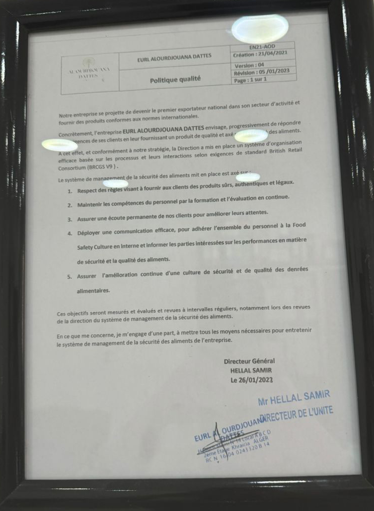 At Al Ourdjouana, our Quality Policy is central to our mission of delivering premium Deglet Nour dates to the global market. We are committed to maintaining the highest standards in every aspect of our operations, from cultivation to packaging and distribution. Our dedication to quality is not just about meeting industry standards—it’s about exceeding them.